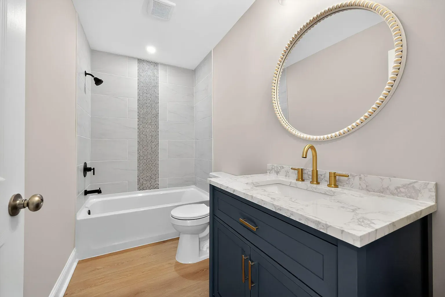 Built-in luxury: The primary suite's double vanity features custom navy cabinetry, quartz countertops, and brushed gold fixtures. When you build new, you get it right from day one.