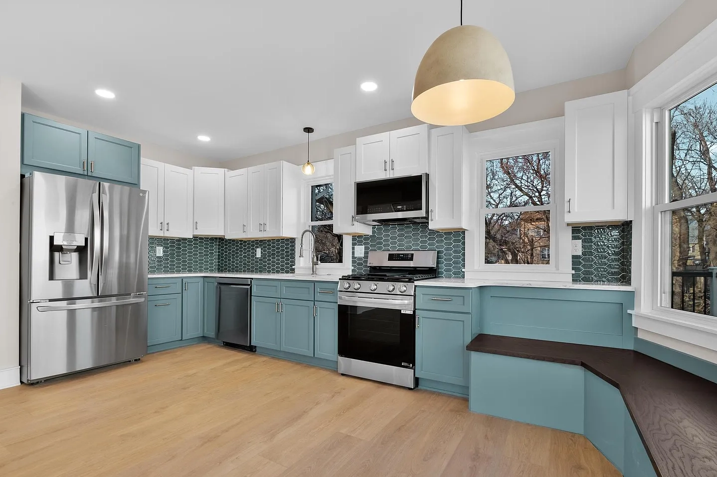 - Kitchen: Upgraded with LG stainless steel appliance package (refrigerator, dishwasher, microwave, self-cleaning oven), quartz countertops, modern cabinetry with sleek hardware